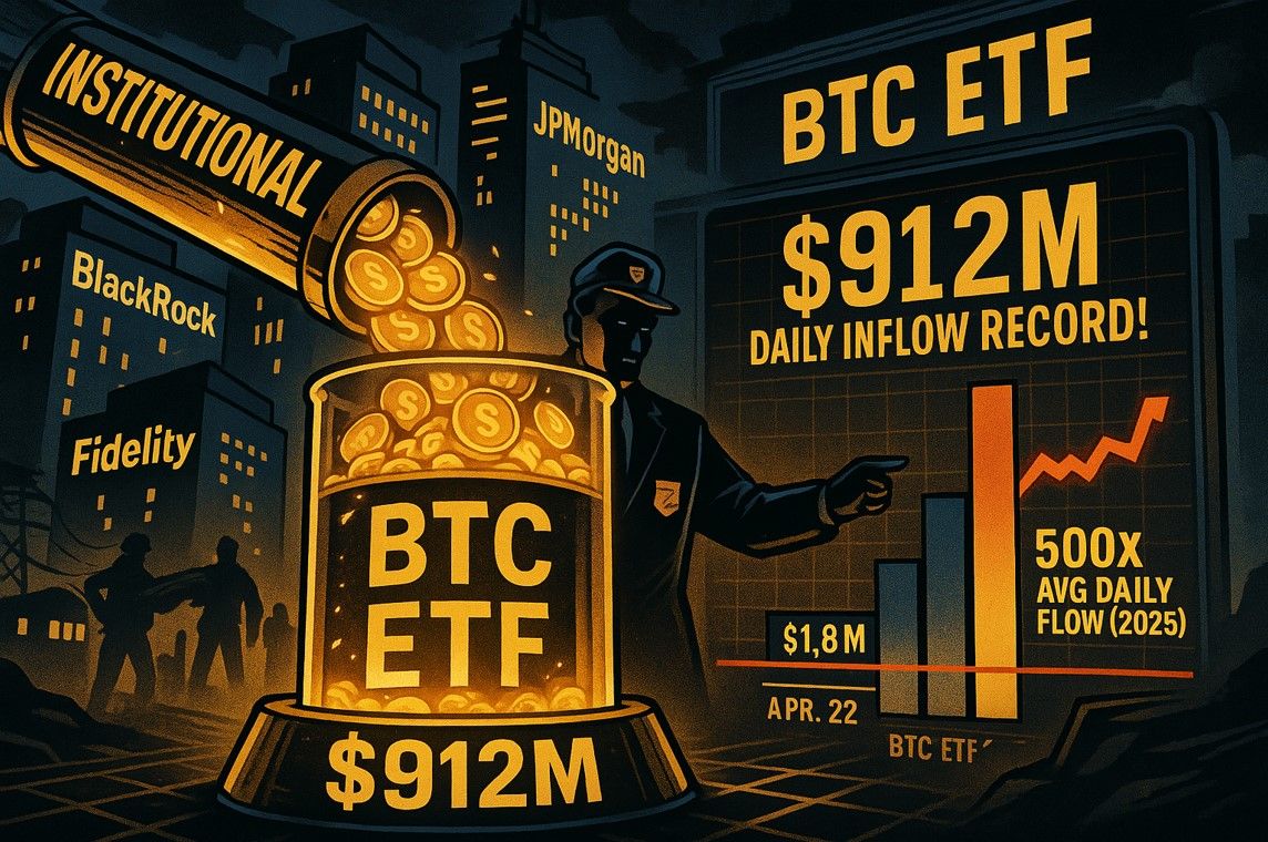 Pada tanggal 22 April, investor institusional kembali menunjukkan minat besar terhadap Bitcoin melalui ETF spot di Amerika Serikat, dengan aliran dana masuk yang mencapai $912 juta hanya dalam sehari. Angka ini setara dengan lebih dari 500 kali lipat dari rata-rata harian tahun 2025, menurut data terbaru dari firma analitik onchain, Glassnode.