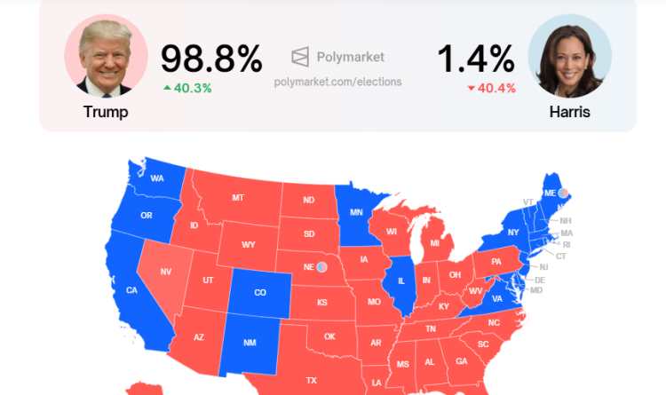 Sementara itu, di platform prediksi Polymarket, peluang kemenangan Trump telah melonjak, yang mengindikasikan pergeseran ekspektasi pasar. Peluang Trump untuk menang meningkat tajam dari 58% menjadi 98,8%. Secara keseluruhan, taruhan pada kedua kandidat mencapai $2,3 miliar, di mana taruhan pada Trump mencapai $1,41 miliar.