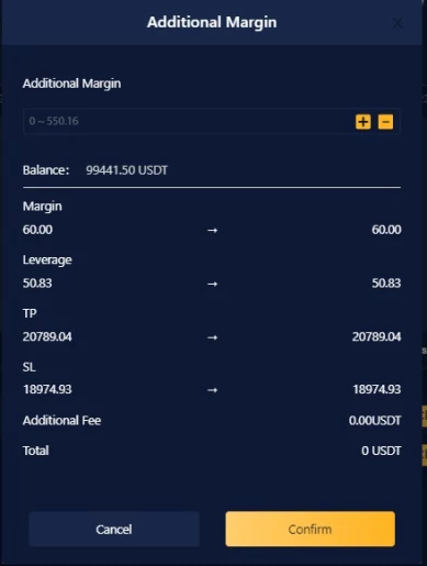 Tombol Tambah (+) memungkinkan untuk menambahkan margin kerja yang lebih besar ke posisi tersebut, Anda tidak pernah dapat menghapus margin, ini berfungsi untuk memberi Anda lebih banyak ruang dalam beberapa keadaan, tetapi berhati-hatilah dengan itu, karena Anda bisa disalahgunakan jika tenggelam saat Anda mengira sedang menyelamatkan diri sendiri, selain itu semua ini akan mengurangi leverage Anda.