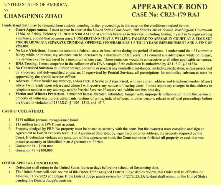 Changpeng Zhao akan membayar uang jaminan sebesar US$175 juta (Rp2,7 triliun) dan setuju untuk kembali ke Amerika Serikat 14 hari sebelum hukumannya pada 23 Februari 2024.
