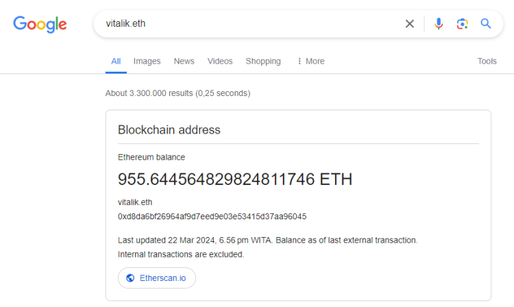 Seperti yang Anda lihat di atas, saat mencari alamat ENS yang berbeda seperti vitalik.eth, maka Google akan menampilkan jumlah saldo wallet yang terkait dengan ENS tersebut.