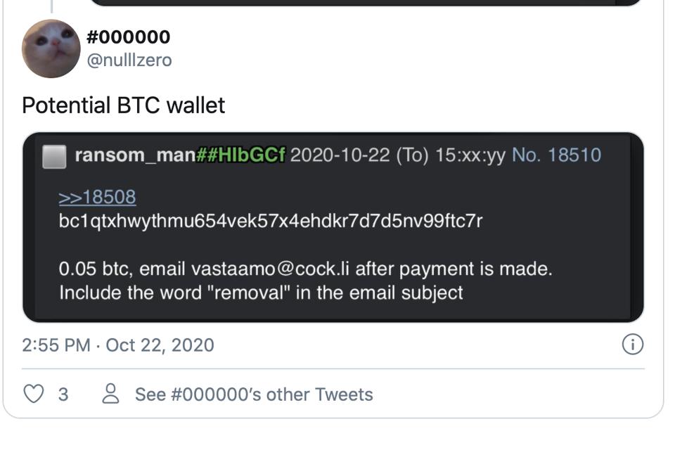 Pengguna mengklaim Dalam sebuah cuitan di twiter yang disebut "Sedikit menarik: Kantor tampaknya telah membayar tebusan" diberikan bersama dengan alamat bitcoin dari tebusan yang seharusnya, 37czPDZbsG8S8nmf85D5XN7D9HfFF3T3ia Pengguna menunjukkan alamat dompet cryptocurrency 37czPDZbsG8SFF8nmf85D5XN7D9TCed permintaan dari r manajemen) dalam periode waktu yang sama dengan saat pemerasan diumumkan. Investigasi internal penulis menyimpulkan bahwa alamat ini dikaitkan dengan platform FTX. Dana 40 BTC tiba di dompet terkait FTX dari penyedia bernama Deribit.