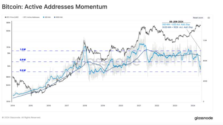Bagan di bawah ini menunjukkan metrik alamat aktif Bitcoin selama dekade terakhir.