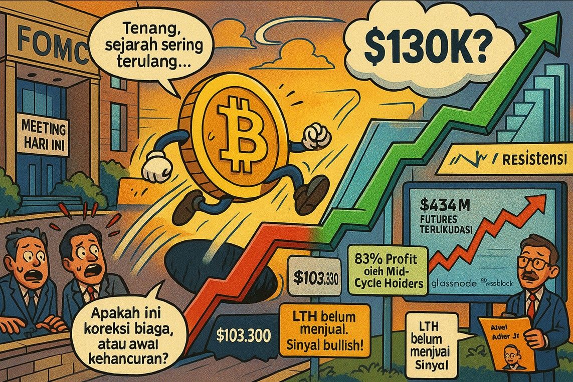 Harga Bitcoin (BTC) sempat tergelincir ke $103.300 pada hari ini setelah para trader mulai mengurangi eksposur risiko menjelang pertemuan Federal Open Market Committee (FOMC) dan pengumuman suku bunga yang dijadwalkan pada Rabu waktu setempat. Koreksi ini mengikuti penutupan mingguan yang bearish, memperkuat sinyal potensi pembalikan tren. Ketegangan geopolitik seperti konflik Israel-Iran turut memperkuat sentimen "risk-off" di pasar.