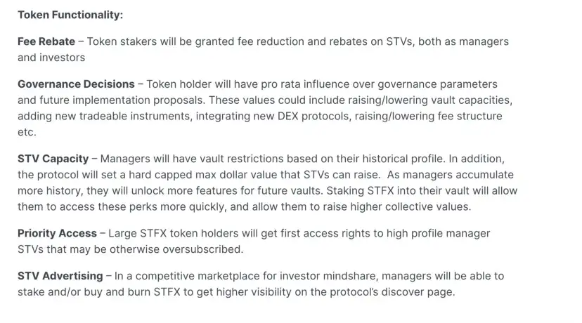 di juga sangat terkesan dengan utilitas terencana dari token mereka, $STFX. Akses prioritas sangat jenius. Misalnya, seorang trader crypto bintang memutuskan untuk membuka brankas di sini. Banyak orang yang ingin bergabung. Memiliki beberapa token STFX dapat memberi Anda akses VIP dibandingkan mereka yang tidak memegang token apa pun.