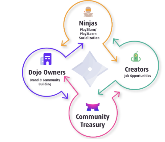 - Play-to-Earn (P2E): Dengan memainkan game in-dojo dan/atau menyelesaikan misi, Ninja akan diberi hadiah token game.
