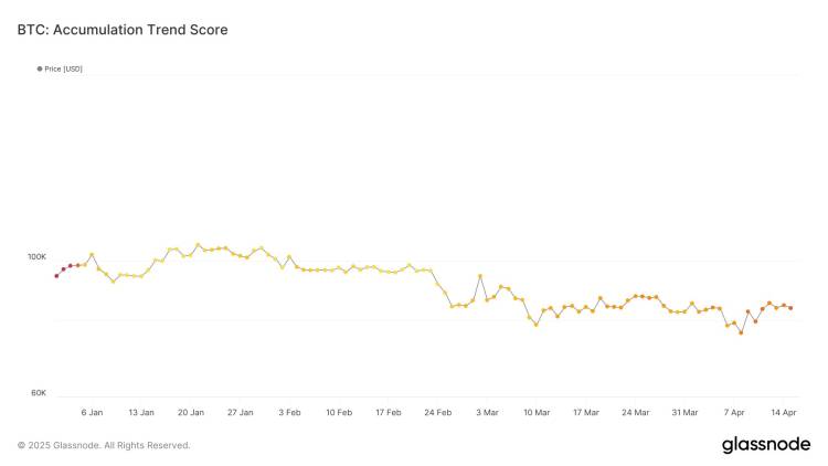 Grafik yang dibagikan Glassnode memperlihatkan bahwa pada Januari lalu, skor akumulasi berada di titik rendah, menandakan distribusi yang kuat di pasar. Namun seiring dengan turunnya harga Bitcoin dalam beberapa bulan terakhir, aktivitas penjualan mulai mereda dan skor ini mulai meningkat.