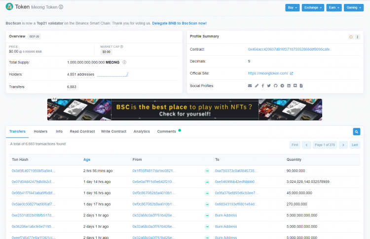 NFT atau Non-Fungible Token adalah unit data yang disimpan di blockchain dan digunakan untuk mensertifikasi objek digital, seperti gambar, video ataupun suara. NFT dibuat menggunakan smart contract dan disimpan di blockchain. Sedangkan file objek digitalnya disimpan di jaringan peer-to-peer IPFS (Interplanetary File Systems). Antara IPFS dan NFT itu terkoneksi. Berikut ini adalah Smartcontract dari MEONG TOKEN.